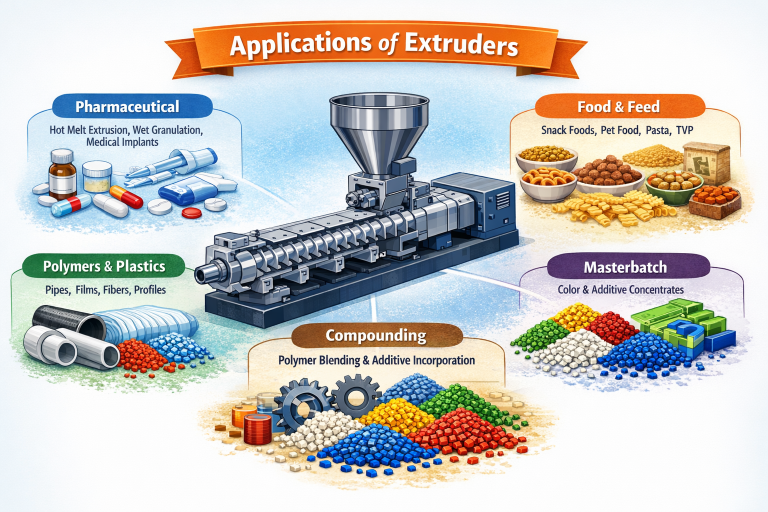 Extruders have diverse applications across multiple industries, playing a crucial role in processing materials through a continuous, controlled shaping process. Key applications span the pharmaceutical, food, polymer, compounding, and masterbatch sectors.
