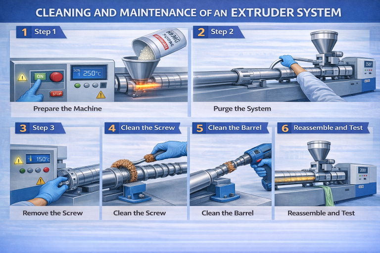Insert a purging compound, such as a cleaning resin, into the hopper and run the extruder until the material exits cleanly.