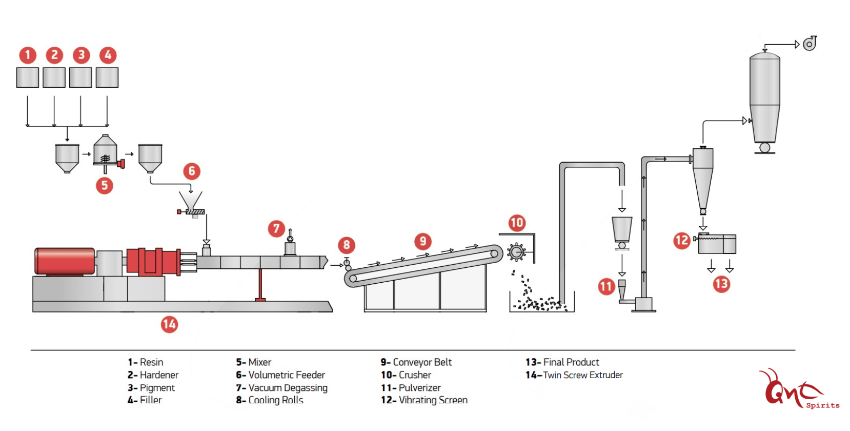 • Compounding/Pelletizing: The extruded material (often a blend of polymers, additives, and fillers) is cut into pellets, which are then used as raw material for further processing in other methods like injection molding or blow molding.